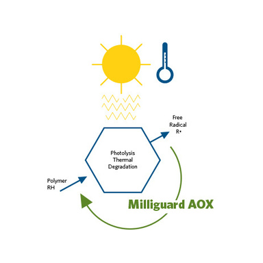 Milliguard AOX antioxidant protects polyurethane (PU) and other thermoset polymers from oxidation and degradation. Specially designed to support polyol suppliers, polyurethane flexible foamers, mattress converters, and other PU producers, it improves the quality and durability of final PU parts by preventing physical deterioration and discoloration caused by exposure to light, heat, and exposure to light, heat, and nitrogen oxides (NOx). This polymeric additive also helps producers to meet high environmental and air quality targets by reducing volatile organic compound (VOC) and outgassing condensation (FOG) emissions.
